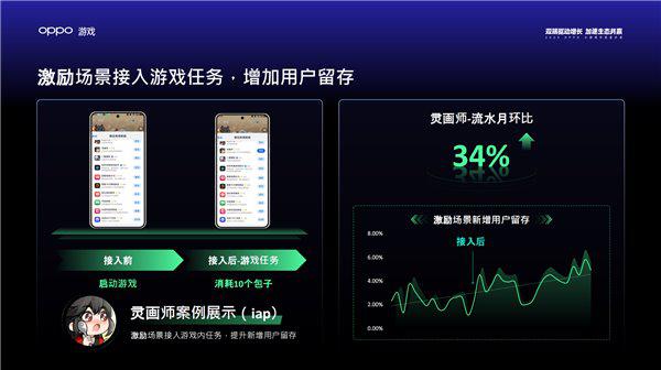 解决技术门槛后,OPPO 游戏在运营端进一步挖掘用户价值。通过场景能力升级,开发者可便捷嵌入游戏任务(如完成游戏某个事件),用户完成任务获得激励,直接带动留存提升。小游戏《灵画师》接入此功能后,激励场景的新增用户留存提升 100%;